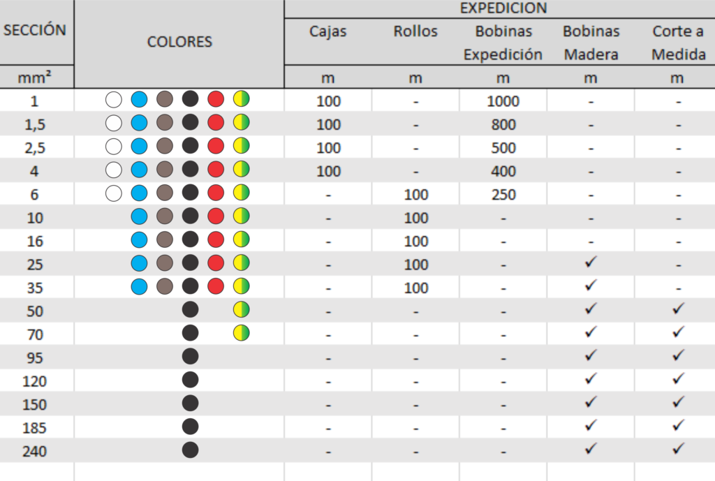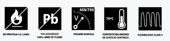 Conductor de cobre recocido flexible clase 4, según norma IRAM NM 280, aislado con PVC tipo A no propagante de llama y libre de plomo. Apto para una temperatura máxima en el conductor de 70 °C en condiciones normales y de 160 °C en condiciones de cortocircuito.
