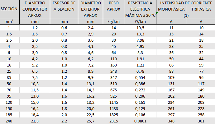(1) Cables instalados en cañerías o a la vista, temperatura ambiente 40 °C, temperatura en el conductor 70 °C. Para otras condiciones deberán aplicarse los correspondientes coeficientes de corrección.