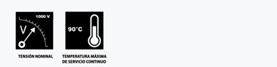 | (1) Cables expuetos al sol, temperatura ambiente 40 °C, temperatura en el conductor 90 °C. | ||||||