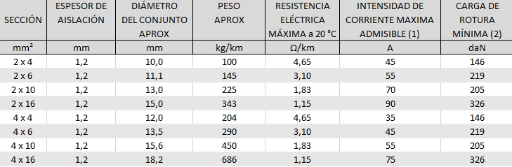 Conductor de cobre duro o recocido clase 2 (7 hilos no compactado), según norma IRAM NM 280, aislado con Polietileno reticulado (XLPE) negro resistente a la luz solar. Los conductores aislados se cablean en espiral visible. Apto para una temperatura máxima en el conductor de 90 °C en condiciones normales, de 130 °C en sobrecarga de emergencia y de 250 °C en condiciones de cortocircuito.